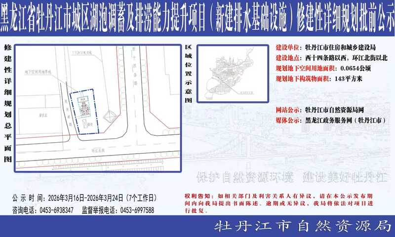黑龙江省牡丹江市城区湖泡调蓄及排涝能力提升项目(新建排水基础设施)修建性详细规划批前公示